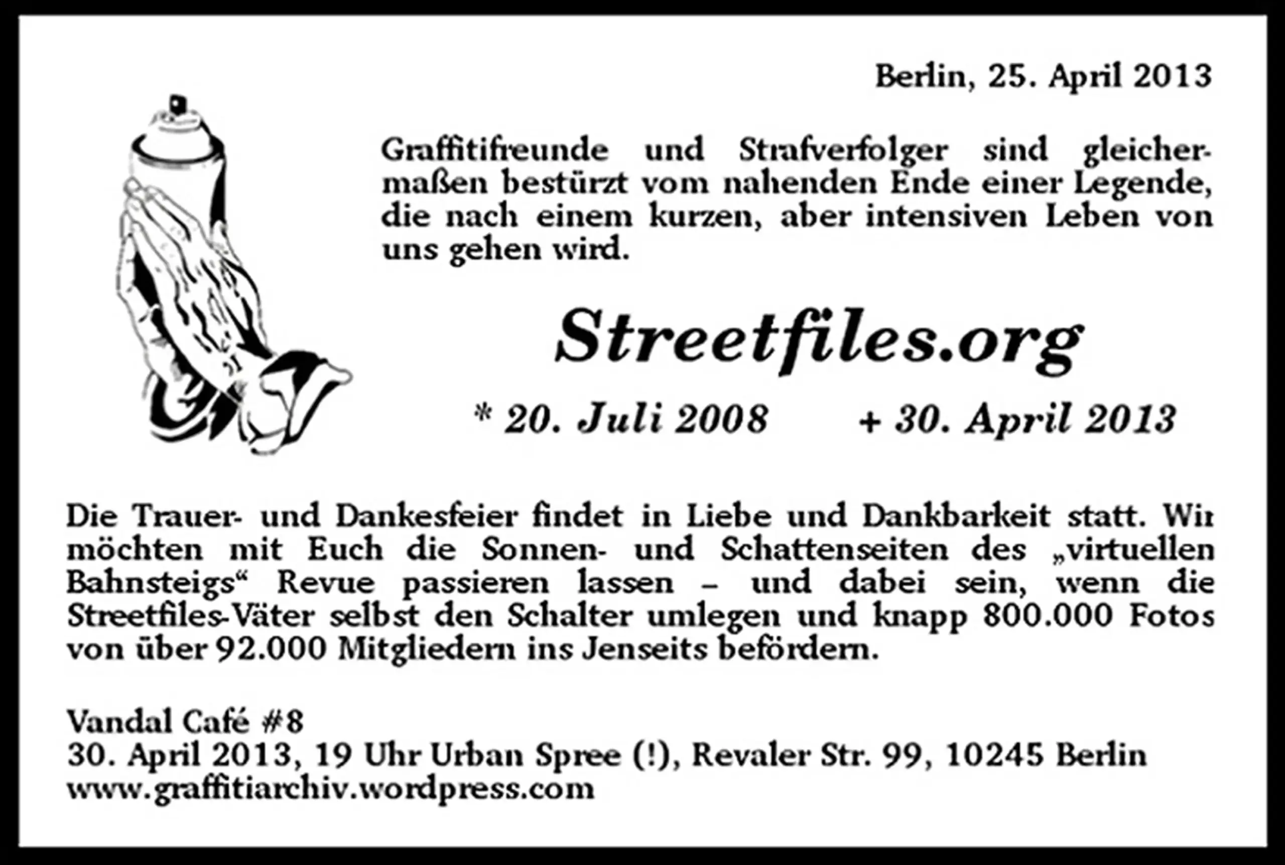 Die Trauer und Dankesfeier findet in Liebe und Dankbarkeit statt. Wir möchten mit Euch die Sonnen- und Schattenseiten des Bahnsteigs“ Revue passieren lassen – und dabei sein, wenn die Streetfiles-Väter selbst den Schalter umlegen und knapp 800.000 Fotos von über 92.000 Mitgliedern ins Jenseits befördern.