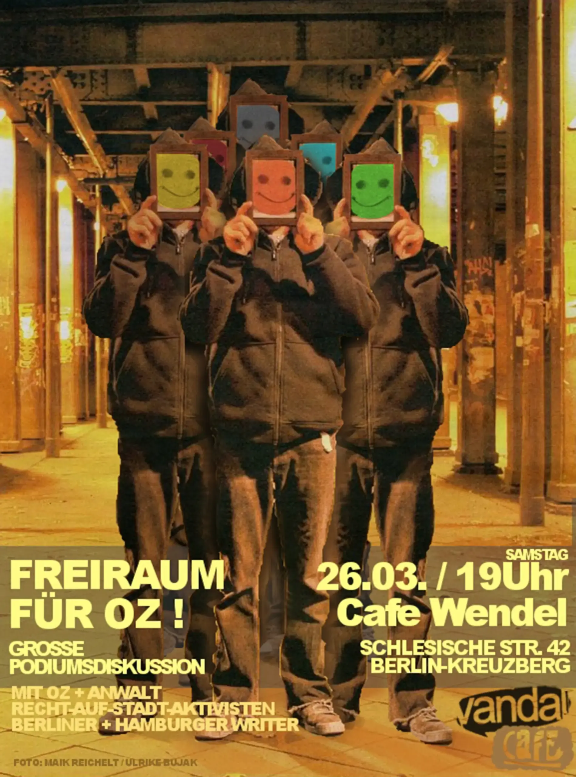 Am Sa., 26.03.11 findet ab 19 Uhr das VandalCafé #4 statt. Diesmal gibt’s eine große Podiumsdiskussion mit OZ + Anwalt, Recht-auf-Stadt-Aktivisten, Jürgen Große (urban. art.info) sowie Hamburger und Berliner Writern. Außerdem steht ein großer Soli-Verkauf an, dessen Einnahmen für den Prozess und die Öffentlichkeitsarbeit von OZ verwendet werden.