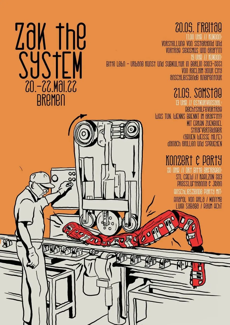 Im Rahmen des ZAK THE SYSTEM Wochenende wollen wir mit zwei Vorträgen das Thema „Female Graffiti“ und „Graffiti als politisches Mittel“ behandeln und neue Denkanstöße setzen. Dazu referiert das Projekt SISTERHOOD, welches weibliche Graffti Künstler*innen international connectet, eine Wanderaustellung plant und eine wichtige Perspektive zu Sexismus im Graffiti geben kann. Danach wird in einem einstündigen Vortrag, die Historie von politischer Praxis des Graffiti in Bezug auf verschiedene Länder und Strömungen skizziert.