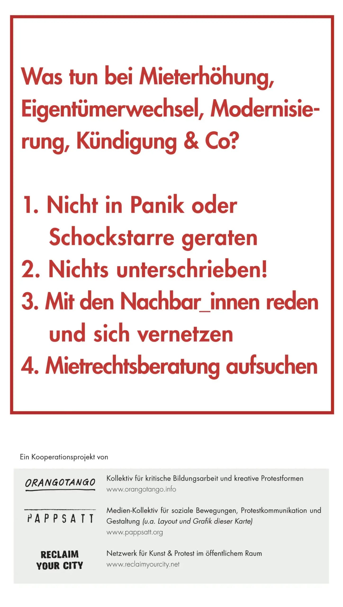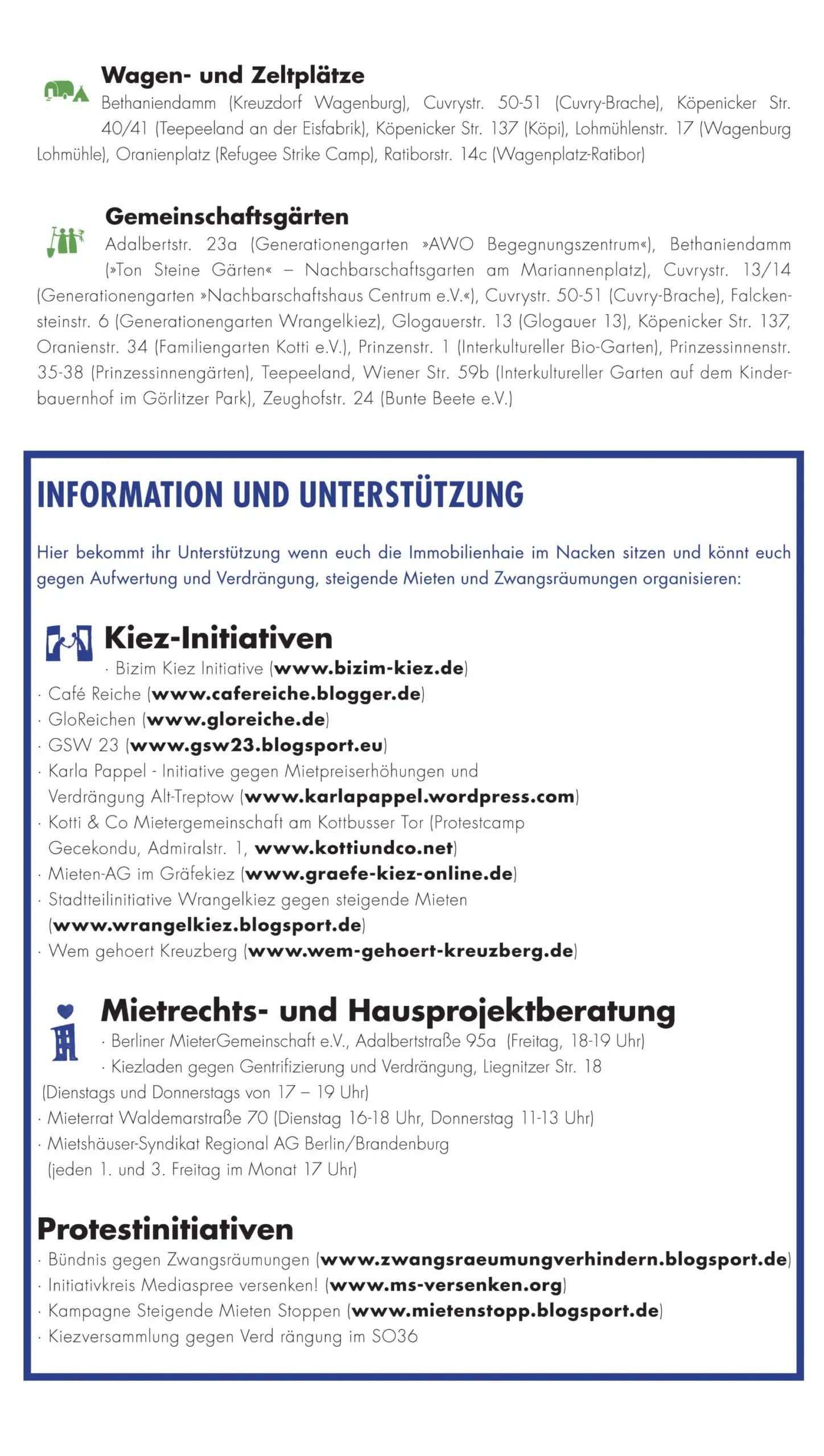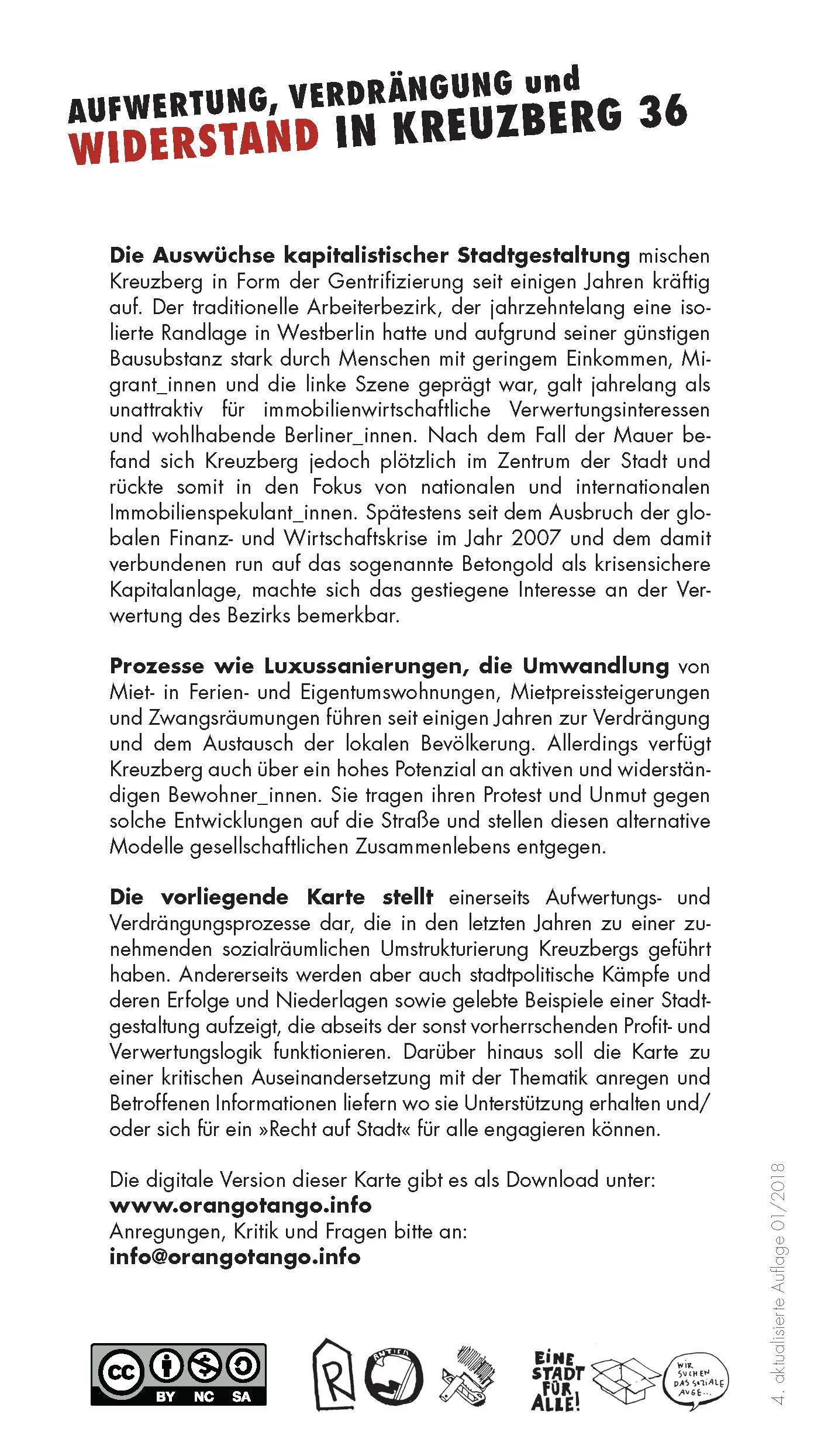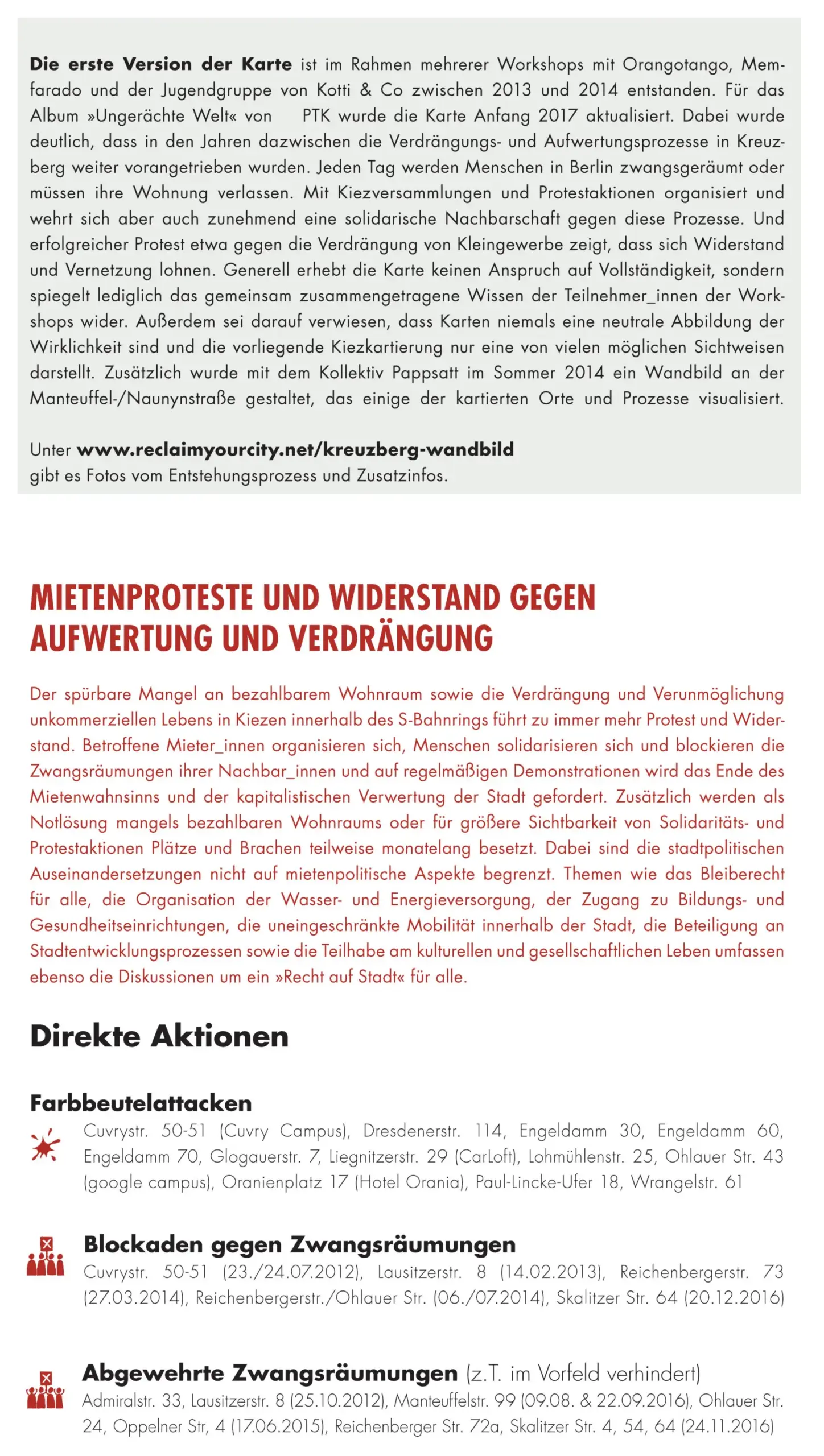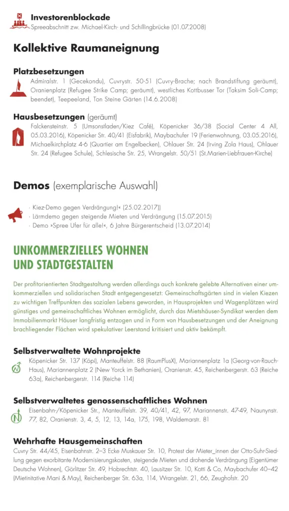Die vorliegende Karte stellt einerseits Aufwertungs- und Verdrängungsprozesse dar, die in den letzten Jahren zu einer zunehmenden sozialräumlichen Umstrukturierung Kreuzbergs geführt haben. Andererseits werden aber auch stadtpolitische Kämpfe und deren Erfolge und Niederlagen sowie gelebte Beispiele einer Stadtgestaltung aufzeigt, die abseits der sonst vorherrschenden Profit- und Verwertungslogik funktionieren. Darüber hinaus soll die Karte zu einer kritischen Auseinandersetzung mit der Thematik anregen und Betroffenen Informationen liefern wo sie Unterstützung erhalten und/oder sich für ein »Recht auf Stadt« für alle engagieren können.