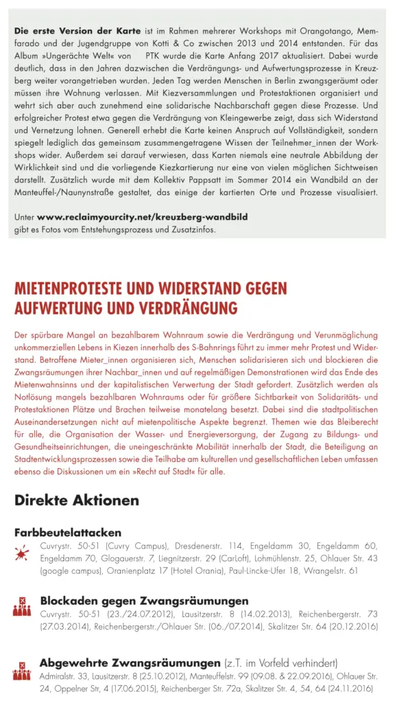 Die erste Version der Karte ist im Rahmen mehrerer Workshops mit Orangotango, Memfarado und der Jugendgruppe von Kotti & Co zwischen 2013 und 2014 entstanden. Für das Album »Ungerächte Welt« von PTK wurde die Karte Anfang 2017 aktualisiert. Dabei wurde deutlich, dass in den Jahren dazwischen die Verdrängungs- und Aufwertungsprozesse in Kreuzberg weiter vorangetrieben wurden. Jeden Tag werden Menschen in Berlin zwangsgeräumt oder müssen ihre Wohnung verlassen. Mit Kiezversammlungen und Protestaktionen organisiert und wehrt sich aber auch zunehmend eine solidarische Nachbarschaft gegen diese Prozesse. Und erfolgreicher Protest etwa gegen die Verdrängung von Kleingewerbe zeigt, dass sich Widerstand und Vernetzung lohnen. Generell erhebt die Karte keinen Anspruch auf Vollständigkeit, sondern spiegelt lediglich das gemeinsam zusammengetragene Wissen der Teilnehmer_innen der Workshops wider. Außerdem sei darauf verwiesen, dass Karten niemals eine neutrale Abbildung der Wirklichkeit sind und die vorliegende Kiezkartierung nur eine von vielen möglichen Sichtweisen darstellt. Zusätzlich wurde mit dem Kollektiv Pappsatt im Sommer 2014 ein Wandbild an der Manteuffel-/Naunynstraße gestaltet, das einige der kartierten Orte und Prozesse visualisiert.
