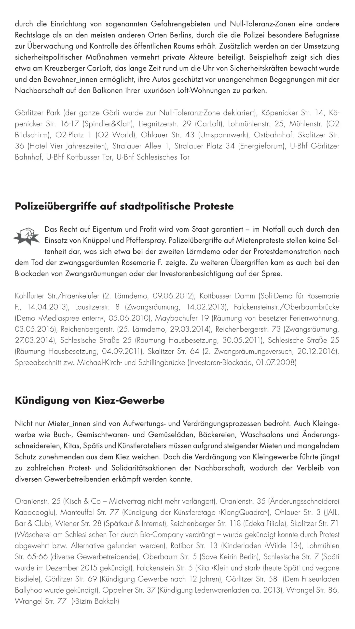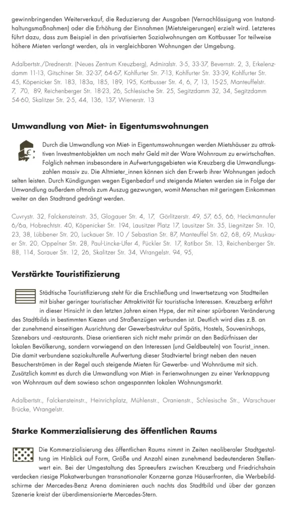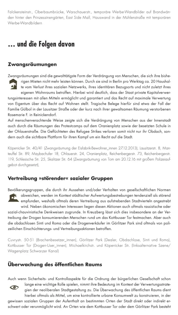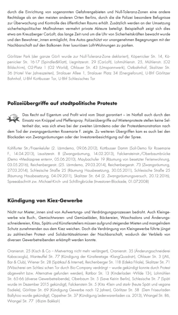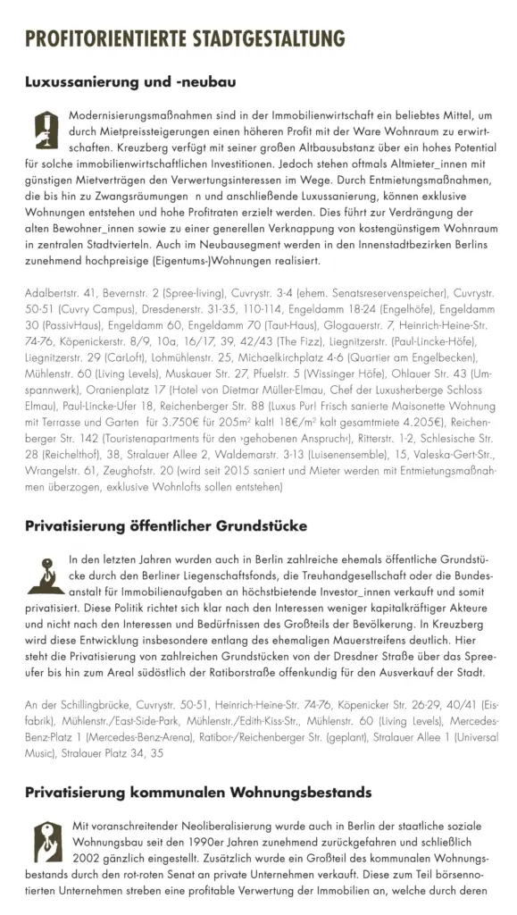 Prozesse wie Luxussanierungen, die Umwandlung von Miet- in Ferien- und Eigentumswohnungen, Mietpreissteigerungen und Zwangsräumungen führen seit einigen Jahren zur Verdrängung und dem Austausch der lokalen Bevölkerung. Allerdings verfügt Kreuzberg auch über ein hohes Potenzial an aktiven und widerständigen Bewohner_innen. Sie tragen ihren Protest und Unmut gegen solche Entwicklungen auf die Straße und stellen diesen alternative Modelle gesellschaftlichen Zusammenlebens entgegen.