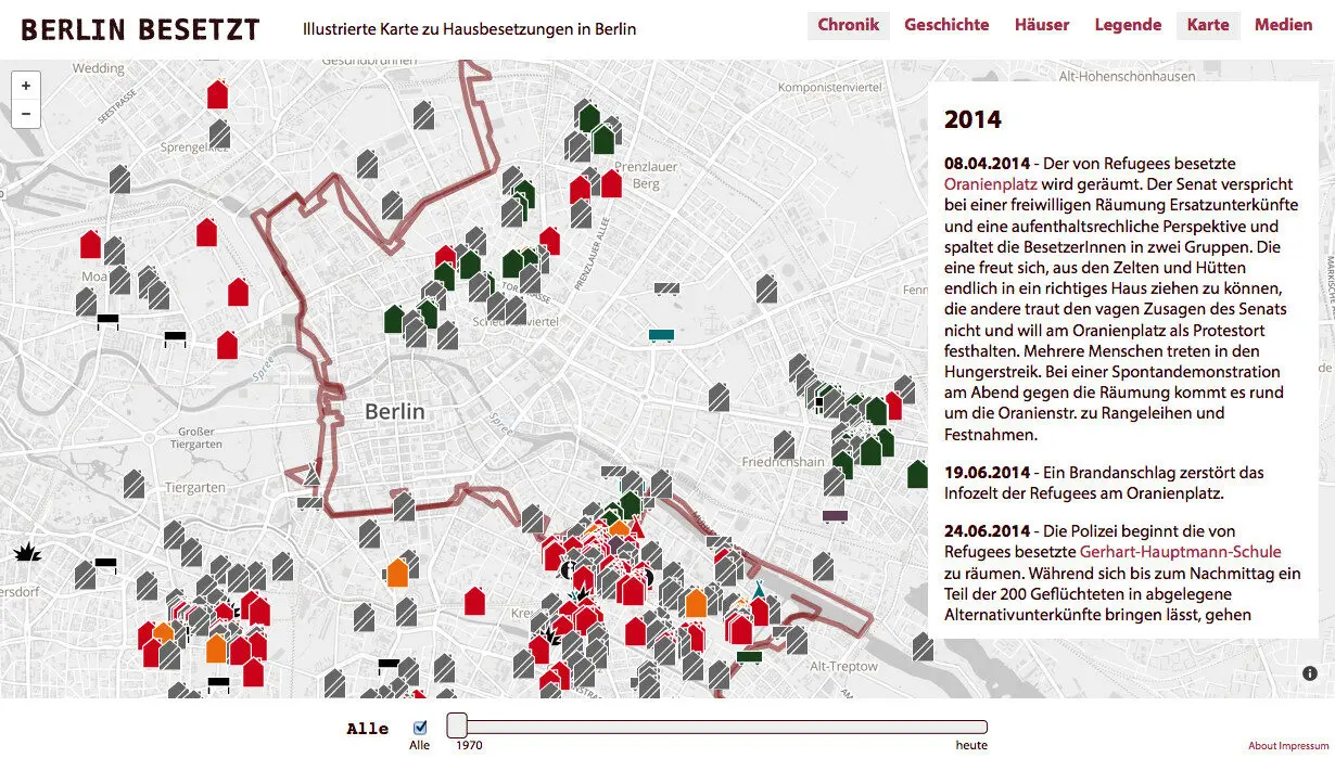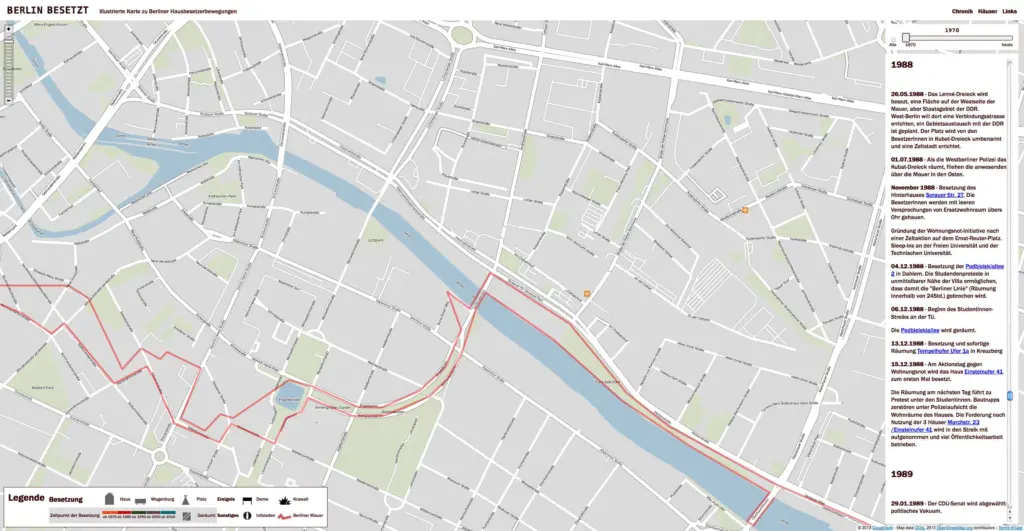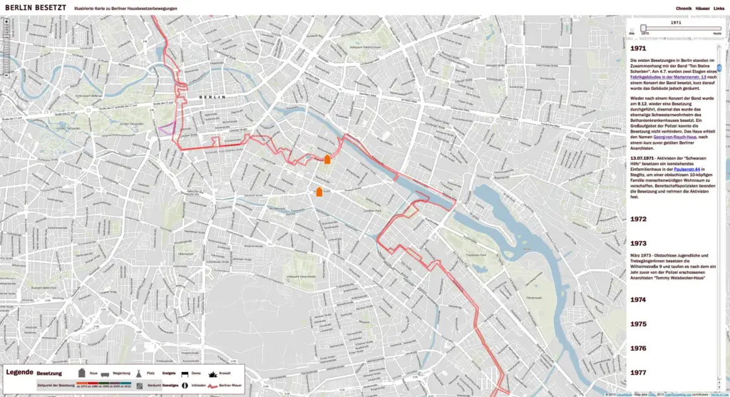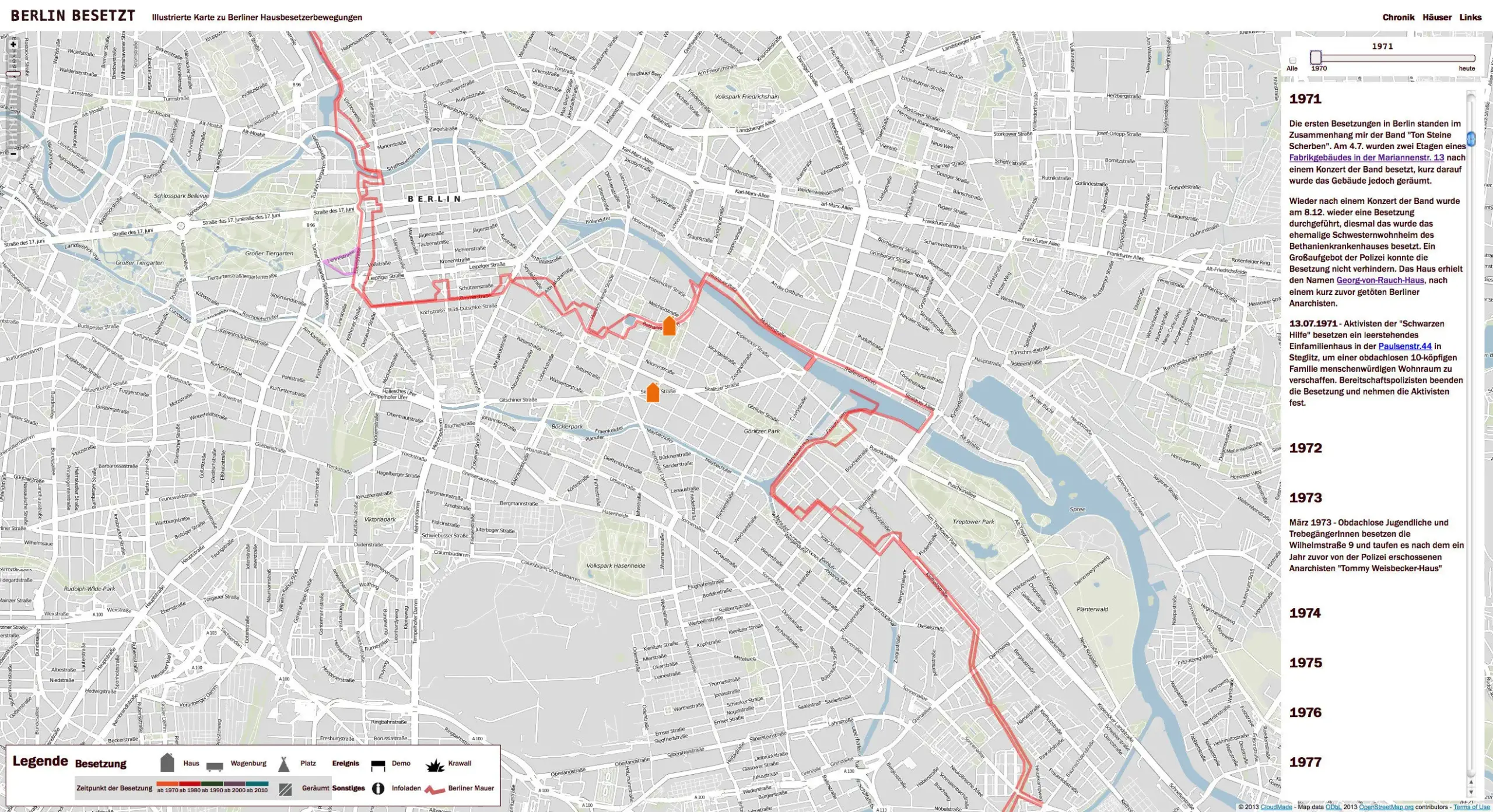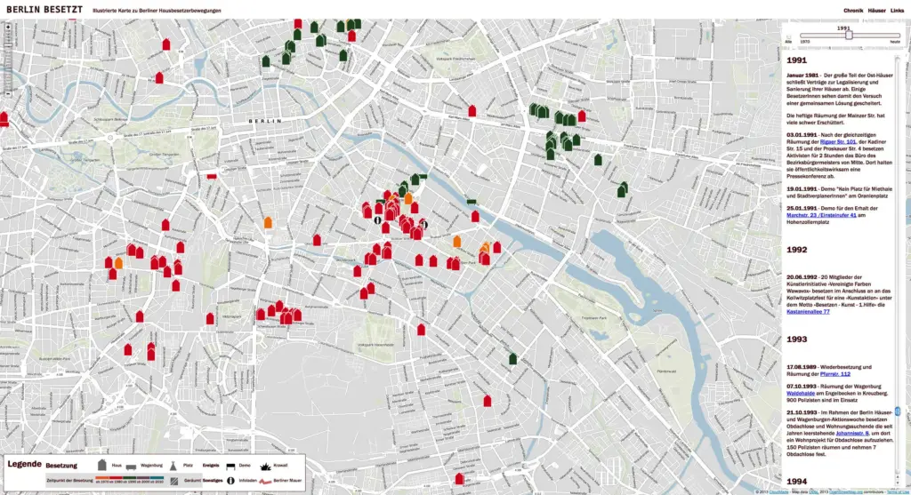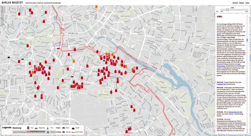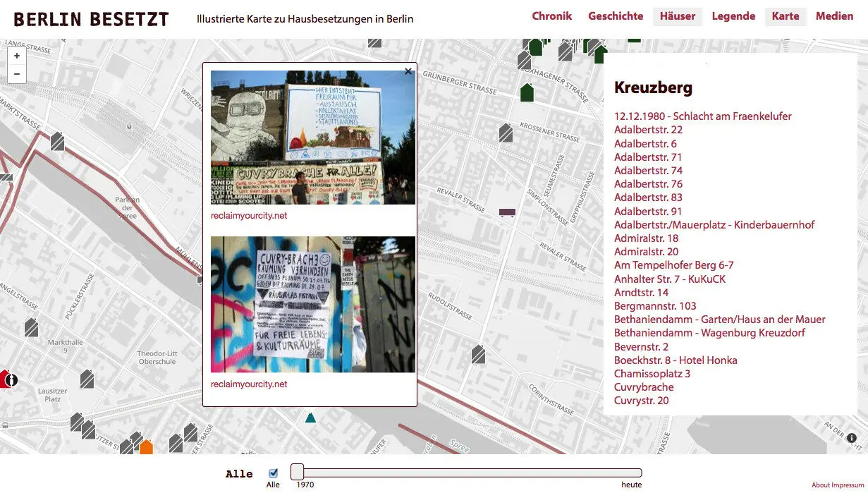 Mit dem interaktiven Online-Stadtplan und digitalem Archiv wollen wir kollektive und selbstverwaltete Räume in der Stadt sichtbar machen. Das Projekt soll den Berliner Stadtraum als Ergebnis von Aneignungskämpfen zeigen, an denen Hausbesetzungen einen (nicht zu unterschätzenden) Anteil haben.