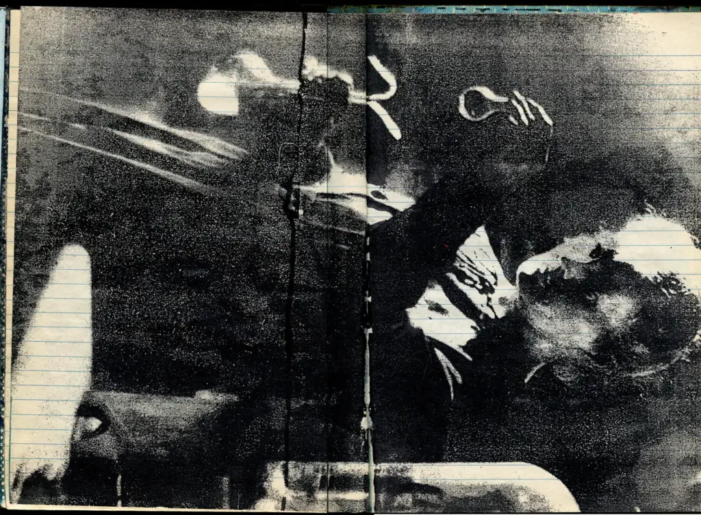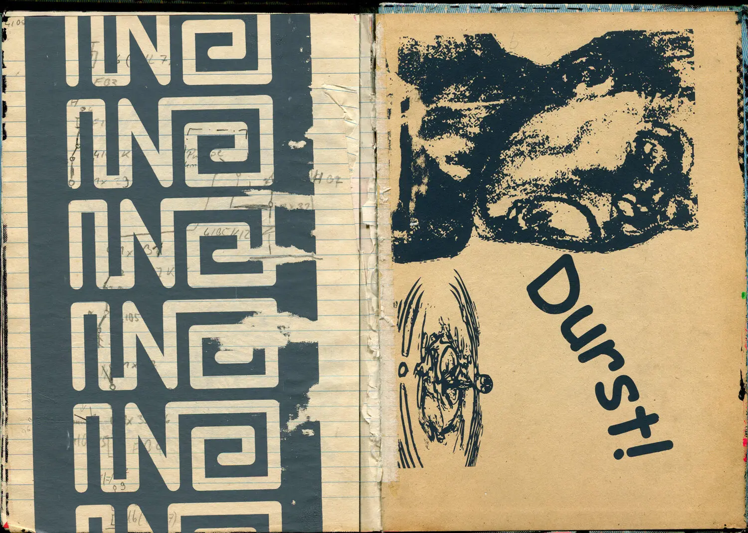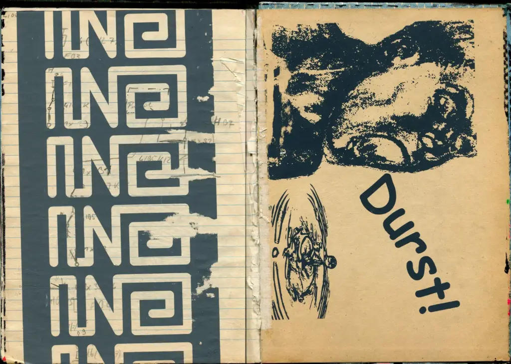 Das leere Buch lag neben dem Papier-Drucktisch und wurde von den jeweils Druckenden mit ihren aktuellen Motiven immer weiter gefüllt. Format: ca. Din A4