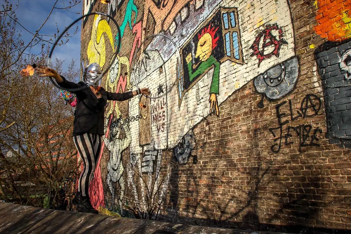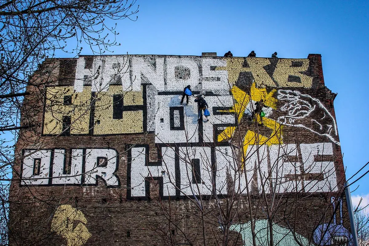 Auf der Seitenwand der Köpi entstand im April 2021 in Zusammenarbeit von Künstler*innen mit dem Wagenplatz und mit der Hausgemeinschaft der Köpi ein neues Fassadenbild.