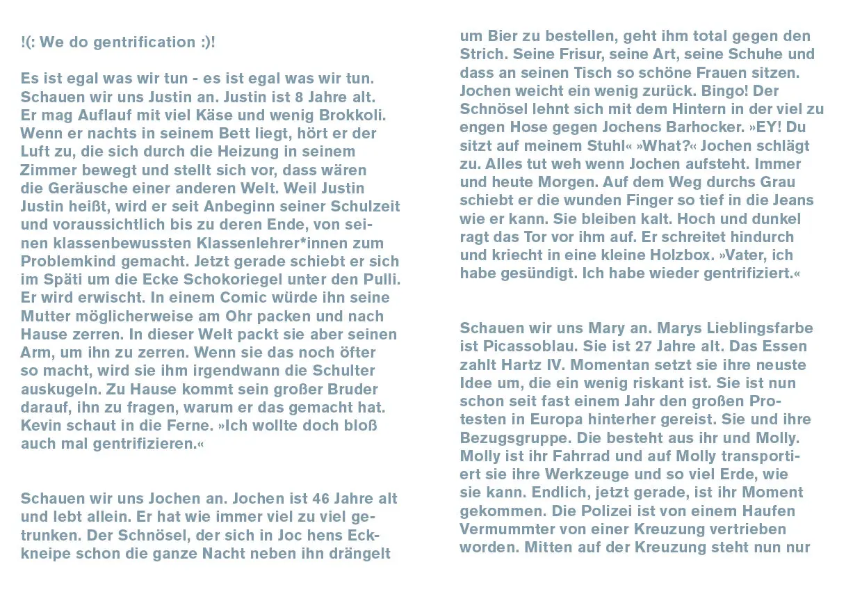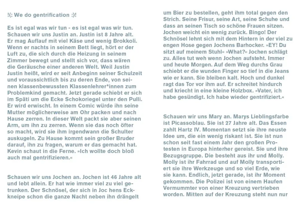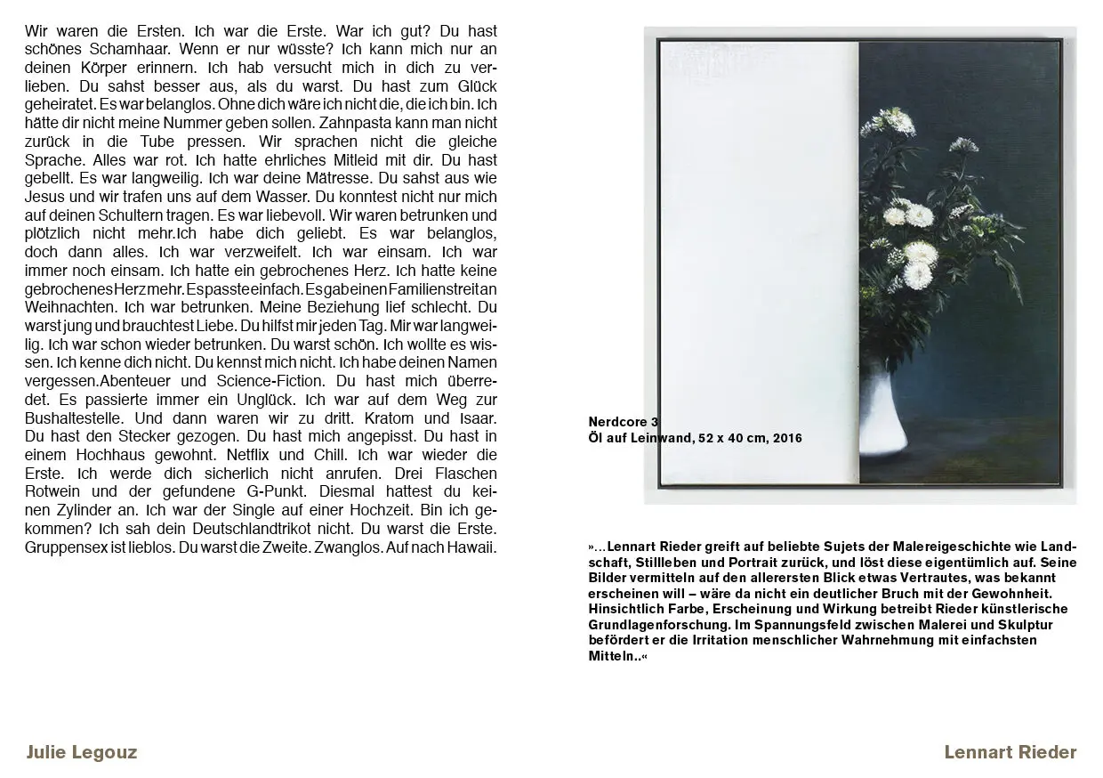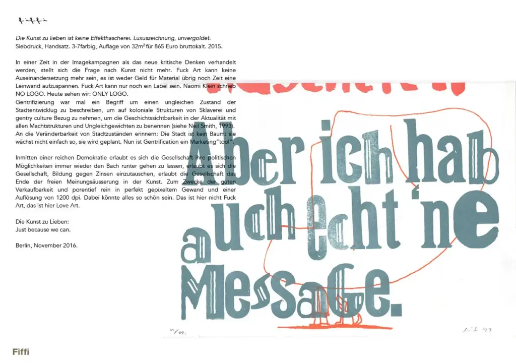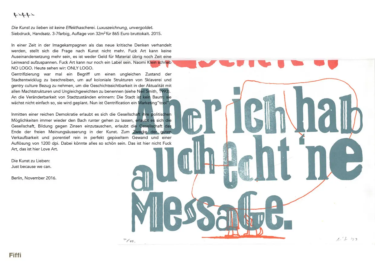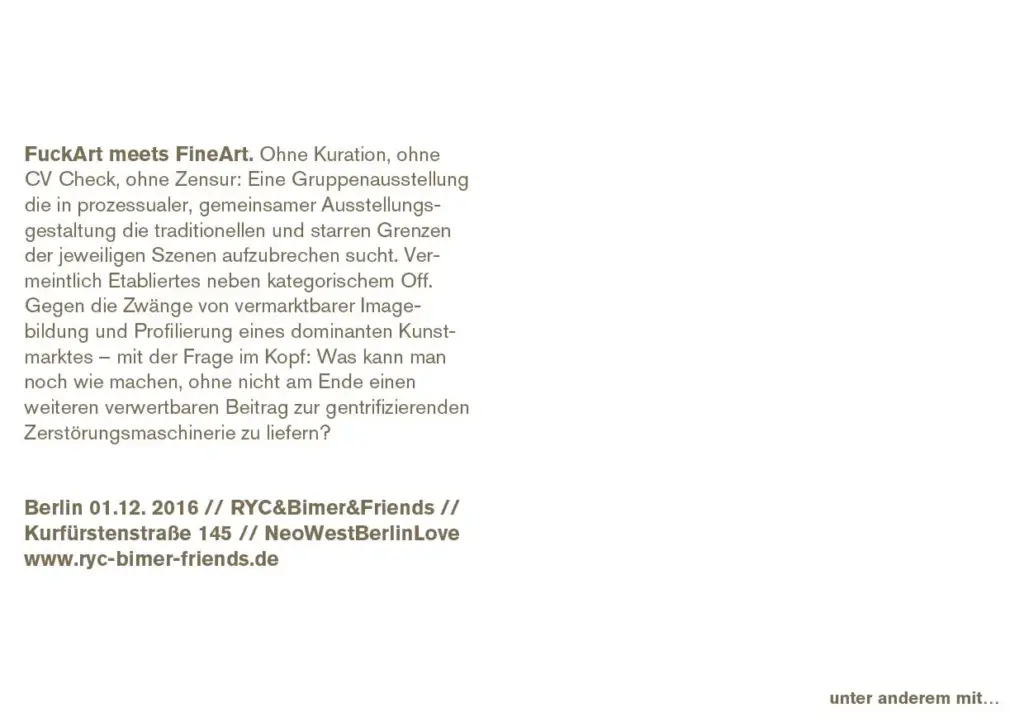 „FuckArt meets FineArt. Ohne Kuration, ohne CV Check, ohne Zensur: Eine Gruppenausstellung die in prozessualer, gemeinsamer Ausstellungsgestaltung die traditionellen und starren Grenzen der jeweiligen Szenen aufzubrechen sucht. Vermeintlich Etabliertes neben kategorischem Off. Gegen­ die Zwänge von vermarktbarer Image­bildung und Profilierung eines dominanten Kunst­marktes – mit der Frage im Kopf: Was kann man noch wie machen, ohne nicht am Ende einen weiteren verwert­baren Beitrag zur gentrifizierenden Zerstörungs­maschinerie zu liefern?