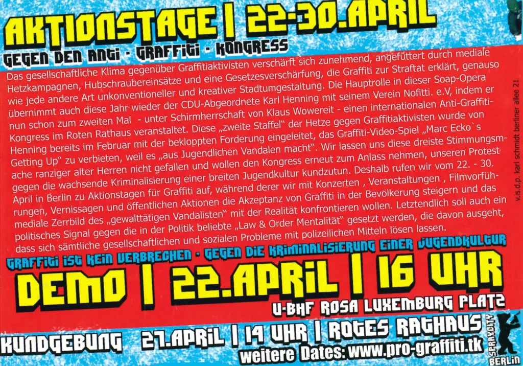 Am 26/27.April veranstaltete der Verein Nofitti.ev mit Schützenhilfe des Berliner Senats im Roten Rathaus den zweiten internationalen Anti-Graffiti-Kongress. Aus Protest gegen die von populistischen Sicherheitsfanatikern betriebene Dämonisierung der Graffiti-Kultur hat sich ein breites Bündnis aus Jugendeinrichtungen, Künstlern, politischen Gruppen und Einzelpersonen zusammengefunden. Vom 22. bis zum 30.April ruft das Bündnis zu Aktionstagen gegen die Kriminalisierung nicht-kommerzieller Kunstformen auf.
