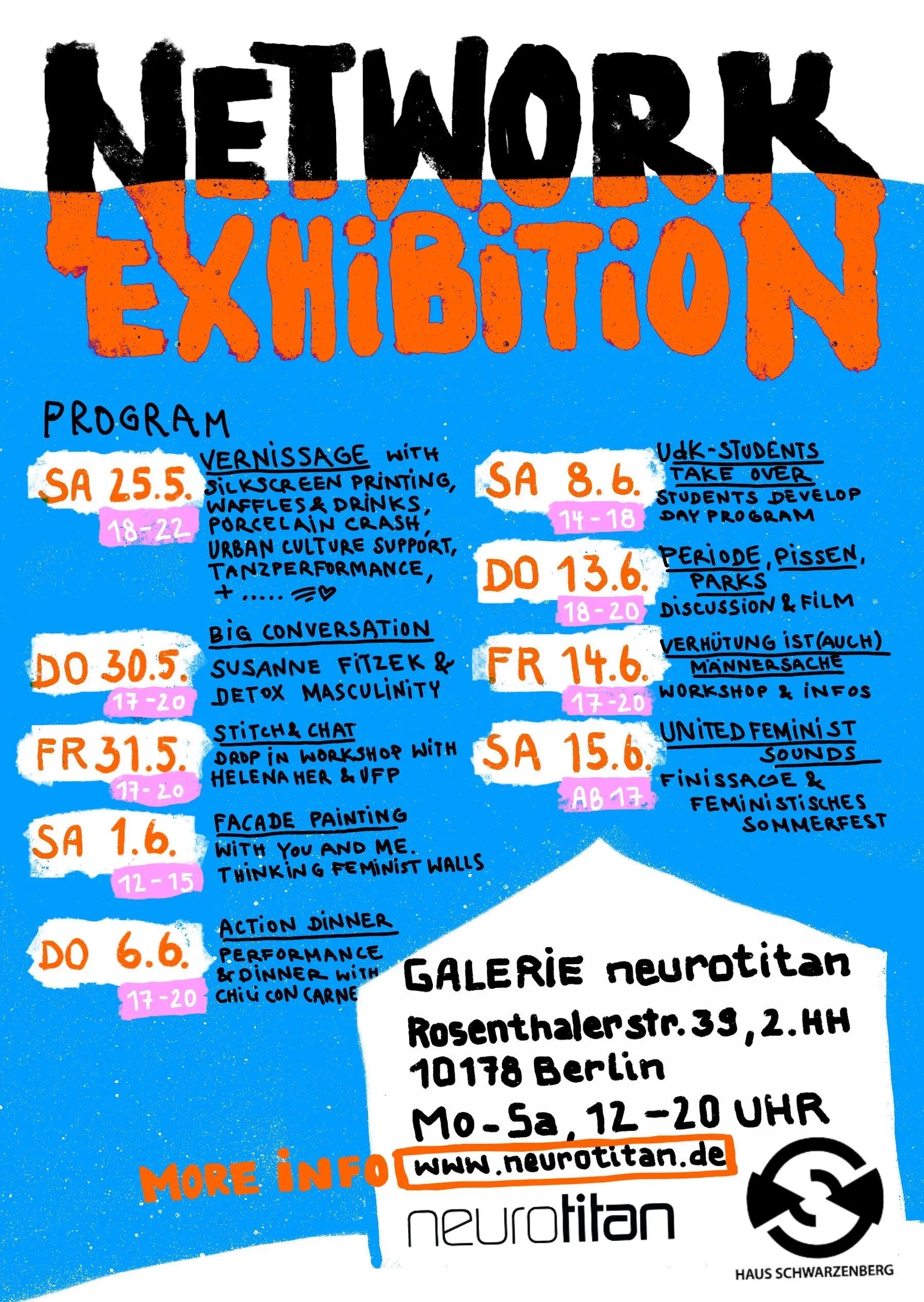 Die Ausstellung ist als Netzwerk-Ausstellung konzipiert. Künstler*innen, Projekte und Einrichtungen sind eingeladen, sich durch Beiträge zu beteiligen. Feministische Sichtweisen bedeuten für uns auch, gemeinsam Spaß zu haben und uns miteinander zu verbinden. Genauso wie es innerhalb der Ausstellung viel Raum für Austausch und miteinander Kunst machen gibt, ist auch das Rahmenprogramm dahingehend ausgelegt, sich über Kunstpraktiken kennenzulernen, Ideen und Vorstellungen zu teilen und gemeinsam in Aktion zu treten. Kommt vorbei!