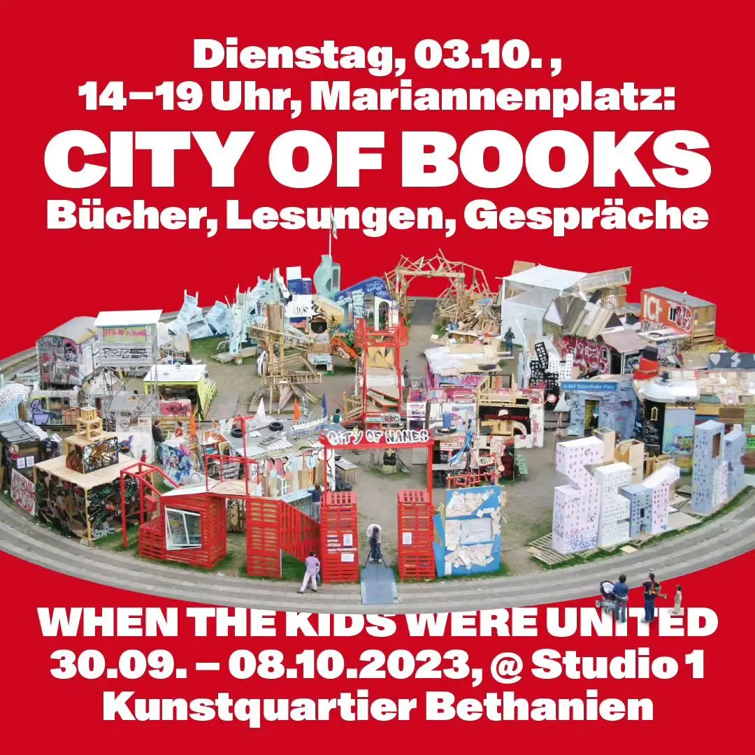 WHEN THE KIDS WERE UNITED ERÖFFNUNG: Freitag, 29.09. ab 18:00 Im Sommer 2005 entstand auf dem Mariannenplatz in Berlin Kreuzberg die City of Names. Sieben Wochen existierte eine Stadt in der Stadt, erbaut von über 50 Akteur:innen der internationalen Graffitiszene, der Kunstwelt und Menschen aus der Nachbarschaft. City of Names wurde zur sozialen Plastik, zum Experiment und Abenteuerspielplatz. Die Ausstellung WHEN THE KIDS WERE UNITED zeigt ungesehene Videoaufnahmen von 2005 in Kombination mit aktuellen Interviews von über 30 Zeitzeug:innen, neue Positionen der damals Beteiligten und ein Programm. Wir treffen uns am Mariannenplatz in Kreuzberg, um die City of Names von Heute zu sehen und das Archiv lebendig werden zu lassen. GEÖFFNET: 30.09.2023 – 08.10.2023 11:00 – 19:00 Uhr. Geschlossen am 02.10. (am 03.10. geöffnet)