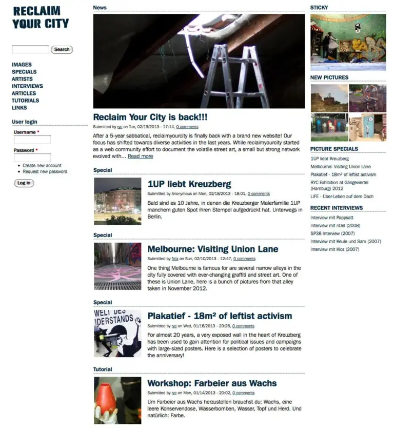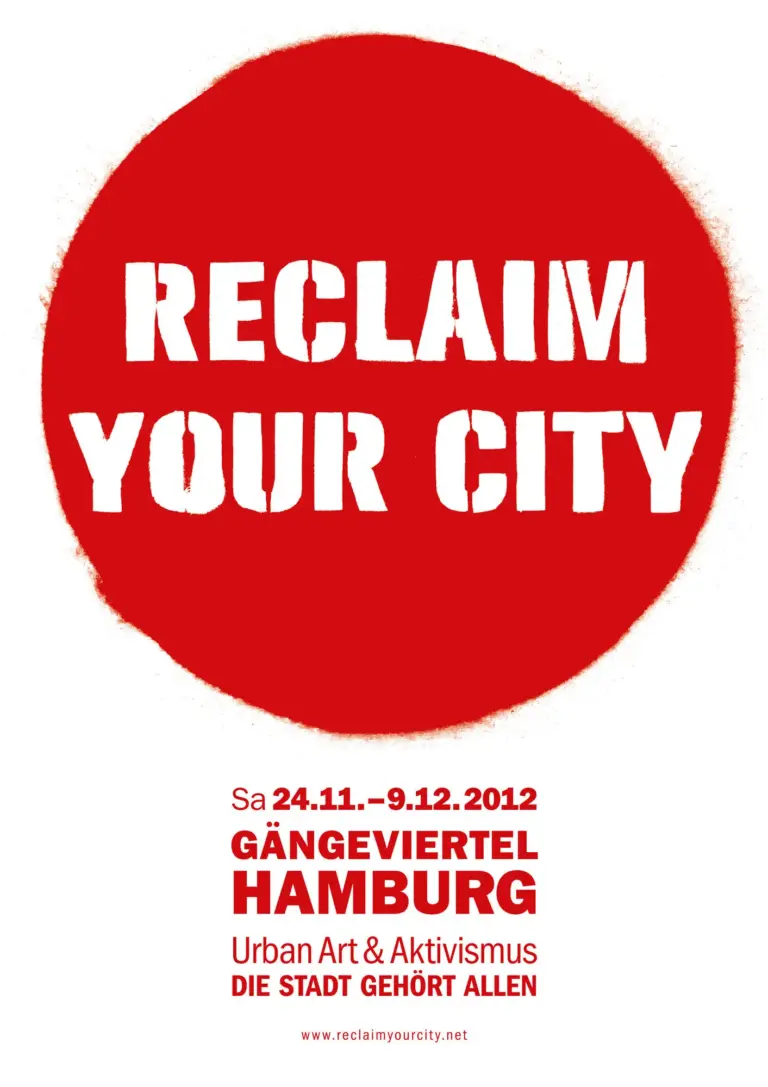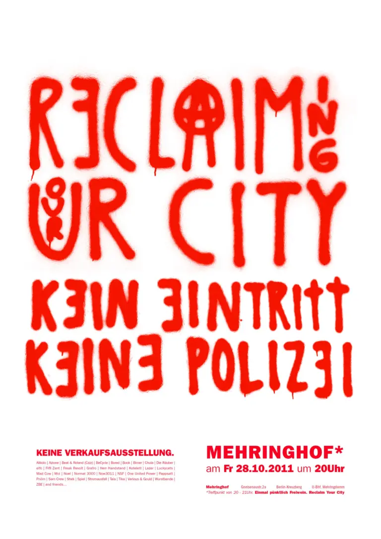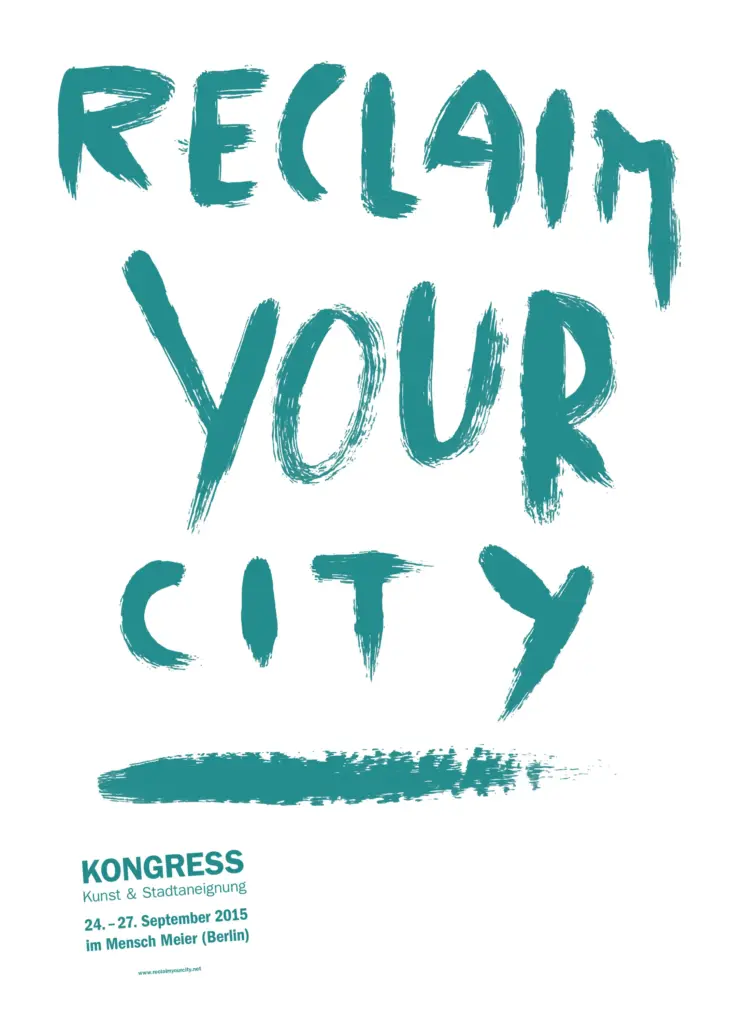 RECLAIM YOUR CITY ist ein Netzwerk und Archiv von Künstler*innen und Gruppen, die sich seit 2009 zu kollektiv organisierten Ausstellungen, Wandmalaktionen, Kongressen und temporären Besetzungen zusammenfinden. Es verbindet Interventionsformen wie Urban Art, Graffiti, Raves und kritische Kartierungen mit stadtpolitischen Protesten, Kiez-Aktionismus und solidarischen Bewegungen gegen Rassismus und Nationalismus. »Reclaim Your City« steht für eine Aneignung des Stadtraums von unten. Nicht um von ihm Besitz zu ergreifen und ihn zu privatisieren, sondern um für einen gleichberechtigten Zugang zu Wohnraum, Bildung und Kultur zu streiten sowie Entwürfe einer anderen, solidarischen Gesellschaft sichtbar zu machen. Das Kollektiv ist die Kunst!
