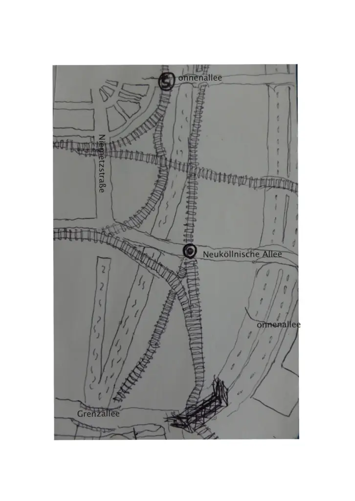 Den Schlüssel betrachtend im Urzeigersinn: die Zufahrt zu einer Papierfabrik, die Neuköllnische Allee über den Kanal, eine Zementfabrik, eine Glaserei, die Autobahnbaustelle, ein Post-Verteilerzentrum, eine Weiterbildungseinrichtung, eine Bunkeranlage und schließlich wieder diese verlassenen Gleisanlagen.