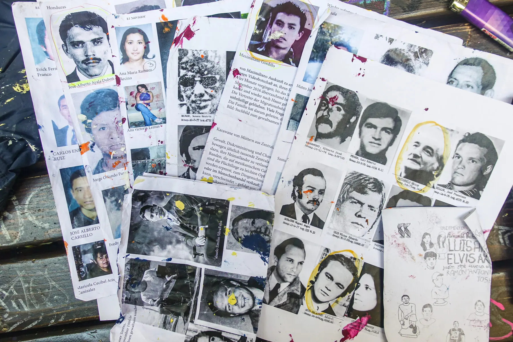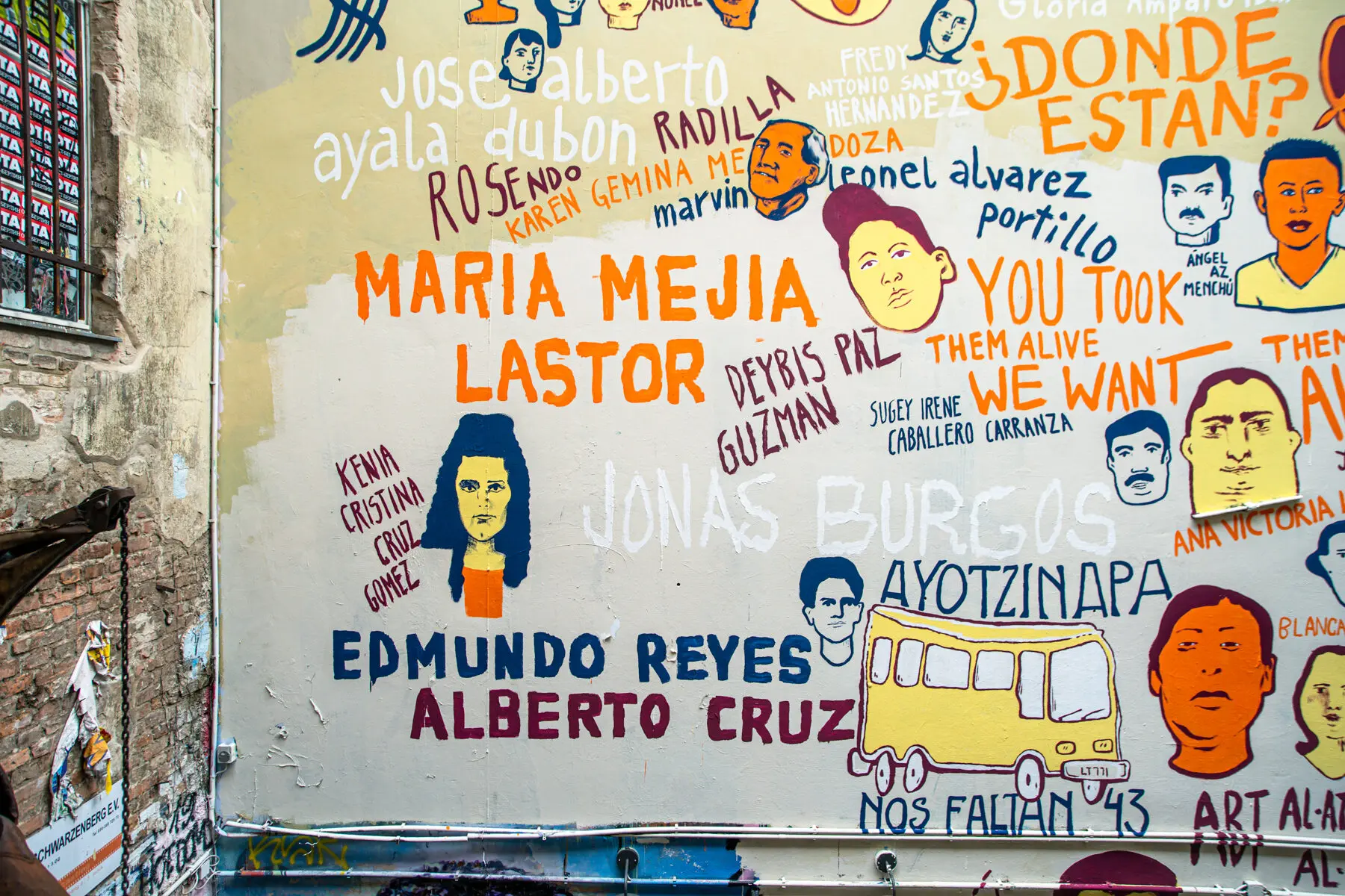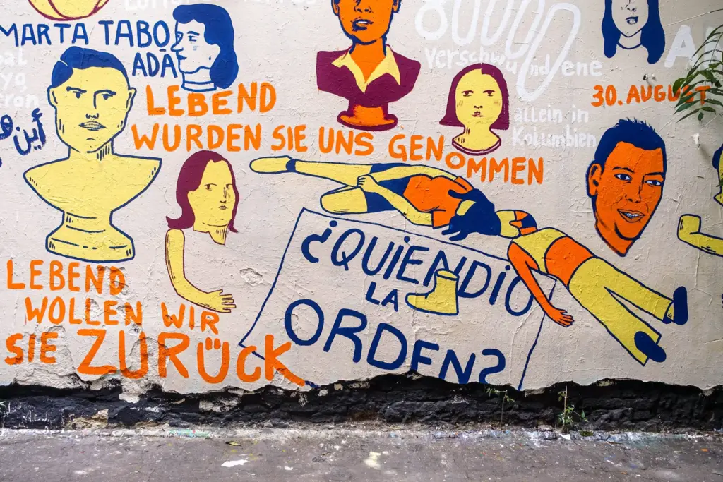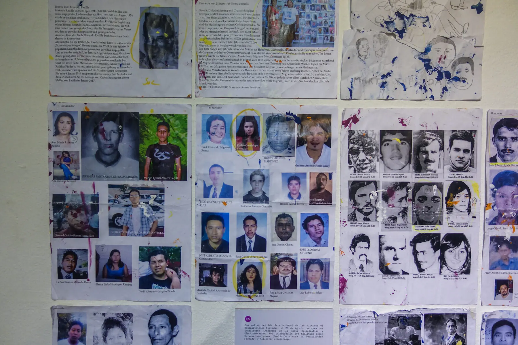 Wandbild zum Internationalen Tag der Verschwundenen am 30. August 2021 im Hinterhof des Haus Schwarzenberg in Berlin. Es zeigt Portraits und Namen von verschwundenen Personen, die den Künstler*innen von Menschenrechtsorganisationen und zum Teil von den Angehörigen der Verschwundenen zugeschickt wurden. Das Wandbild entstand in Kooperation mit der “Koalition gegen Verschwindenlassen” und ist Teil der Ausstellung „León Ferrari – Reproducing Them Infinitely“ in der Galerie Neurotitan, im selben Gebäude. León Ferrari hat 1977 einen Sohn durch gewaltsames Verschwindenlassen verloren, die Familie ist anschließend nach São Paulo ins Exil gegangen.